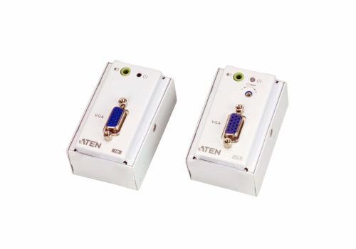 The Aten VE022 Mini VGA /Audio CAT 5 extender can extend audio and video transmission up to 150 with superior video quality 1920 1200 @60Hz (30m), 1600 x 1200@60Hz(100 m) and 1280 x 1024@60Hz(150m). It features Adjustable Gain Control lets you manually adjust signal strength to compensate for distance and audio enabled (mono). Data Sheet -