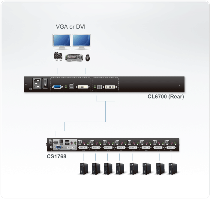 For added convenience, a port for an external USB mouse is provided on the CL6700N front panel, while ports for an extra console (USB mouse, USB keyboard, DVI monitor and VGA monitor) for a second user are provided on the rear panel.
