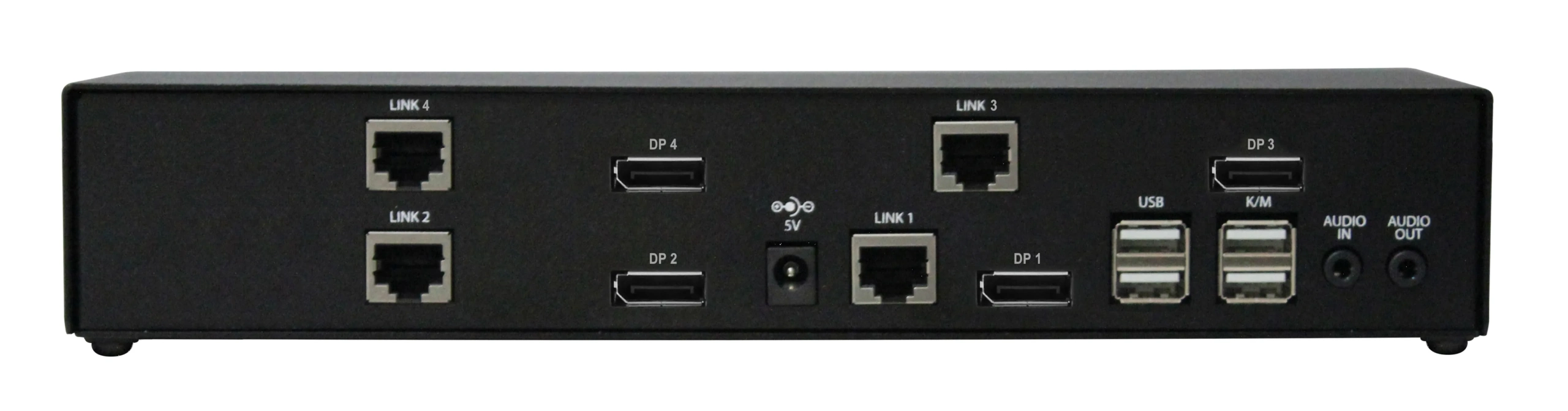 SmartAVI DPX-XT-4P 4K USB 2.0 and Quad-Head DisplayPort KVM up to 100m CAT 5 Extender extends Quad DisplayPort 1.1 and 1.2, USB 2.0 and audio up to 330 ft (100 m) from the source, supports up to 3840×2160 digital video resolution @ 30Hz with uncompressed Video. It also supports keyboard and mouse USB 1.1 and features Transparent USB 2.0.  It carries DP, USB 2.0 and Audio Over a Four CAT 5e/6/6a with DisplayPort Auxiliary Bypass. NEW