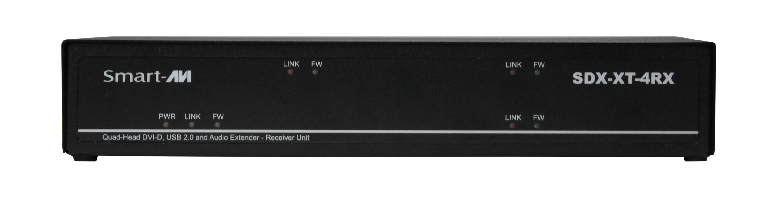 SmartAVI SDX-XT-4P is a Quad Head DVI-D (1920×1200), USB 2.0, USB keyboard-mouse and stereo audio extender, sending signals up to 500 ft (152 m) away over FOUR conventional and inexpensive CAT5/5e/6 cables. This new technology is superior to older DVI extenders that require a special CAT6 shielded cable to go a short distance. NEW