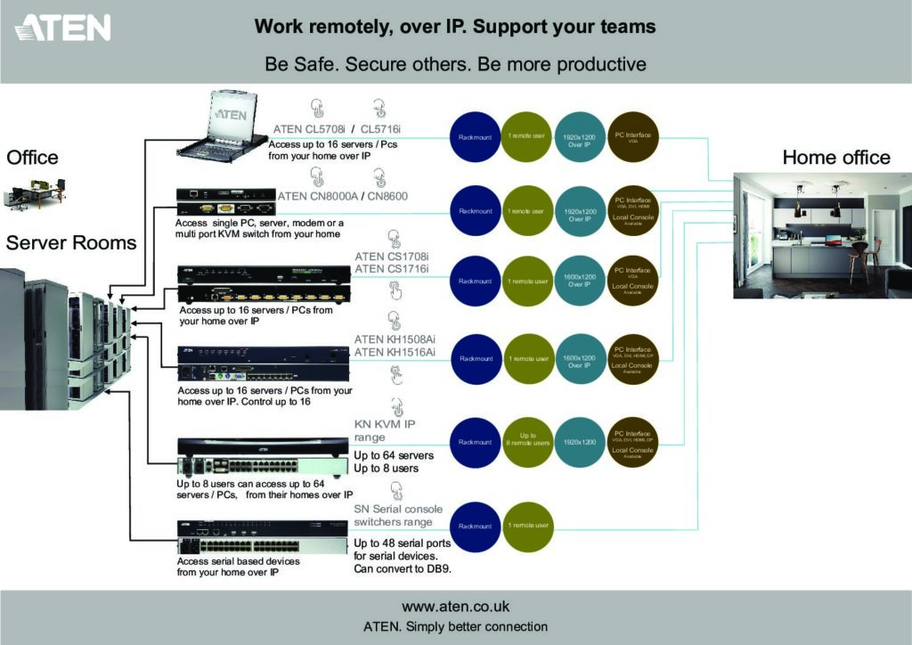 ATEN are promoting their range of Over-IP solutions to assist with this transition, enabling remote connections to computers that have to remain in the workplace, therefore maintaining operation and critical services. Aten Over IP Offers